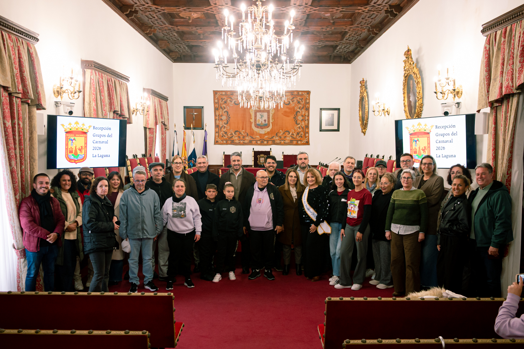 El alcalde de San Cristóbal de La Laguna, Luis Yeray Gutiérrez, ha recibido este miércoles, 4 de marzo, a una representación de los distintos grupos laguneros que han participado en los concursos y galas del Carnaval de Santa Cruz de Tenerife 2026. El acto se ha desarrollado en el Salón de Plenos del Consistorio, en el que también han tomado parte varios concejales y concejalas de la Corporación local.